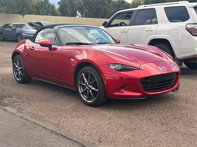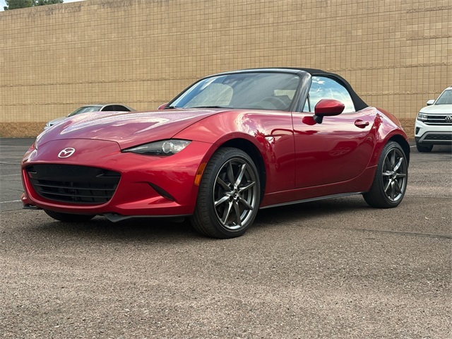 Serving The Valley For Over 40 Years! This Mazda MX-5 Miata is equipped with the following features: 4-Wheel Disc Brakes, 9 Speakers, ABS brakes, Advanced Keyless Entry System, Air Conditioning, Alloy wheels, AM/FM radio: SiriusXM, Auto High-beam Headlights, Auto-dimming door mirrors, Auto-dimming Rear-View mirror, Automatic temperature control, Brake assist, Bumpers: body-color, CD player, Convertible roof lining, Convertible roof wind blocker, Delay-off headlights, Driver vanity mirror, Dual front impact airbags, Dual front side impact airbags, Electronic Stability Control, Emergency communication system: Mazda Connect, Four wheel independent suspension, Front anti-roll bar, Front Bucket Seats, Front Center Armrest, Fully automatic headlights, Garage door transmitter: HomeLink, Glass rear window, Heated door mirrors, Heated front seats, Illuminated entry, Leather Shift Knob, Leather Upholstery, Low tire pressure warning, Navigation System, Occupant sensing airbag, Outside temperature display, Panic alarm, Passenger vanity mirror, Power door mirrors, Power steering, Power windows, Radio data system, Radio: AM/FM/HD w/Navigation & CD Player, Rain sensing wipers, Rear anti-roll bar, Rear window defroster, Reclining Front Heated Bucket Seats, Remote keyless entry, Security system, Soul Red Metallic Paint, Speed control, Speed-sensing steering, Sport steering wheel, Steering wheel mounted audio controls, Tachometer, Tilt steering wheel, Traction control, Trip computer, Variably intermittent wipers, and Wheels: 17" x 7" Dark Silver Aluminum Alloy.