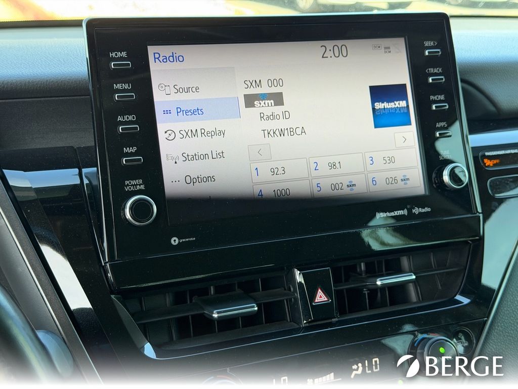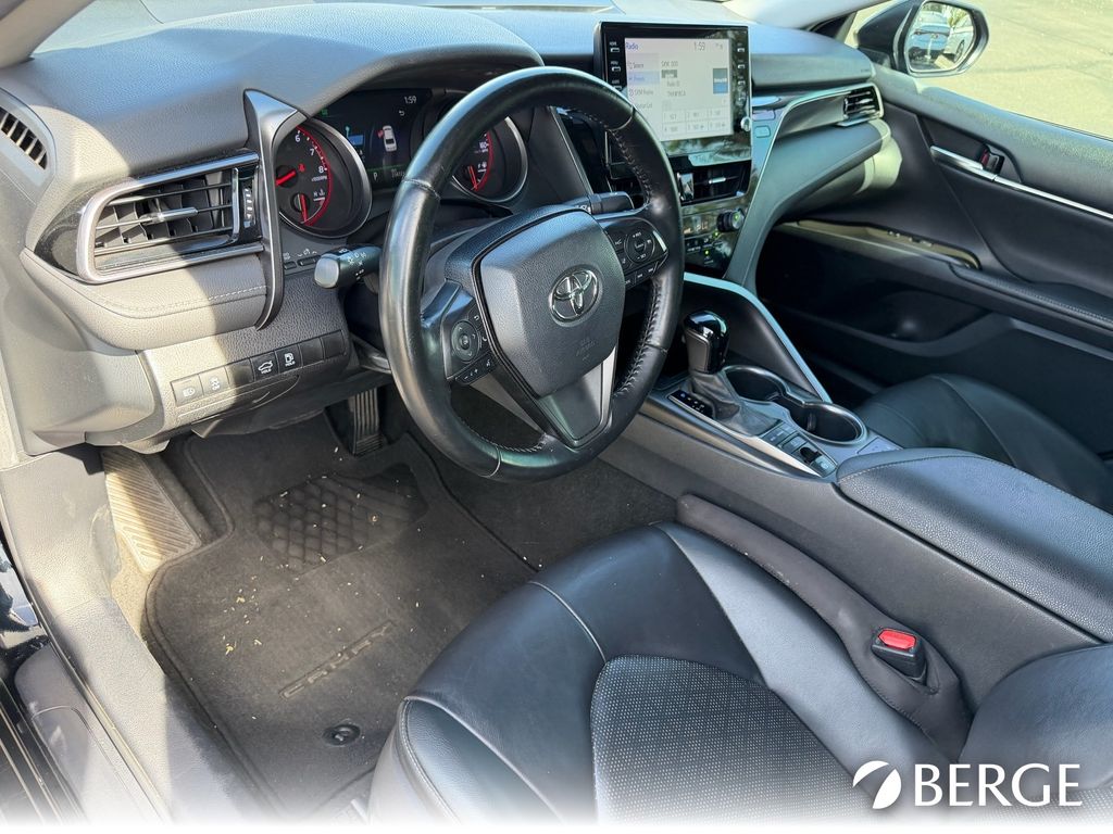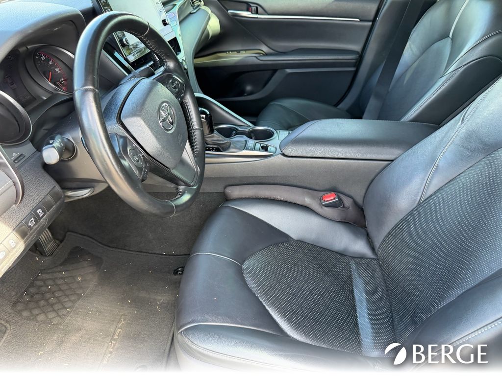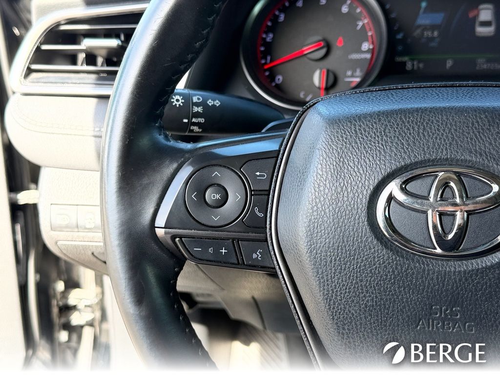 Serving The Valley For Over 40 Years! This Toyota Camry is equipped with the following features: Black Leather, 4-Wheel Disc Brakes, 6 Speakers, ABS brakes, Air Conditioning, Alloy wheels, AM/FM radio: SiriusXM, Apple CarPlay/Android Auto, Auto High-beam Headlights, Auto-dimming Rear-View mirror, Automatic temperature control, Brake assist, Bumpers: body-color, Delay-off headlights, Driver door bin, Driver vanity mirror, Dual front impact airbags, Dual front side impact airbags, Electronic Stability Control, Emergency communication system: Safety Connect with 1-year trial, Exterior Parking Camera Rear, Four wheel independent suspension, Front anti-roll bar, Front Bucket Seats, Front Center Armrest, Front dual zone A/C, Front reading lights, Fully automatic headlights, Garage door transmitter: HomeLink, Heated door mirrors, Heated front seats, Illuminated entry, Knee airbag, Low tire pressure warning, Multi-Stage Heated Front Bucket Seats, Occupant sensing airbag, Outside temperature display, Overhead airbag, Overhead console, Panic alarm, Passenger door bin, Passenger vanity mirror, Perforated Leather Seat Trim, Power door mirrors, Power driver seat, Power passenger seat, Power steering, Power windows, Radio data system, Radio: AM/FM/HD Audio Plus, Rear anti-roll bar, Rear reading lights, Rear seat center armrest, Rear side impact airbag, Rear window defroster, Remote keyless entry, Security system, Speed control, Speed-sensing steering, Split folding rear seat, Spoiler, Steering wheel mounted audio controls, Tachometer, Telescoping steering wheel, Tilt steering wheel, Traction control, Trip computer, Turn signal indicator mirrors, Variably intermittent wipers, and Wheels: 8.0J x 19" Black Machined-Finish Alloy.