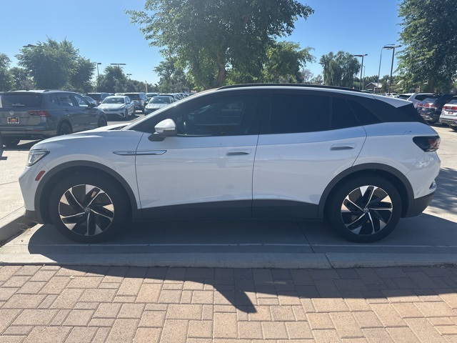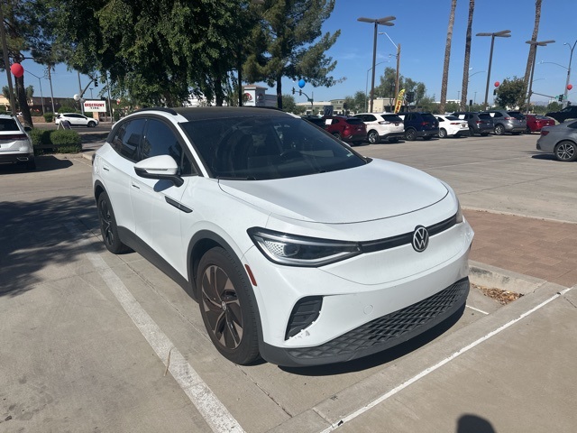 Serving The Valley For Over 40 Years! This Volkswagen ID.4 is equipped with the following features: 4 Wheel Independent Suspension, 4.39 Axle Ratio, 7 Speakers, ABS brakes, Air Conditioning, Alloy wheels, Auto High-beam Headlights, Auto-dimming Rear-View mirror, Automatic temperature control, Brake assist, Bumpers: body-color, Delay-off headlights, Driver door bin, Driver vanity mirror, Driver's Seat Mounted Armrest, Dual front impact airbags, Dual front side impact airbags, Electronic Stability Control, Emergency communication system: VW Car-Net services (capabilities require enrollment or subscription), EV Roadside Assistance Kit, Exterior Parking Camera Rear, First Aid Kit, Four wheel independent suspension, Frameless Auto-Dimming Rearview Mirror w/HomeLink, Front anti-roll bar, Front Bucket Seats, Front dual zone A/C, Front fog lights, Front reading lights, Fully automatic headlights, Heated door mirrors, Heated Front Seats, Heated front seats, Heated steering wheel, Illuminated entry, Low tire pressure warning, Memory seat, Navigation System, Occupant sensing airbag, Outside temperature display, Overhead airbag, Overhead console, Panic alarm, Passenger door bin, Passenger seat mounted armrest, Passenger vanity mirror, Perforated V-Tex Leatherette Seating Surfaces, Power door mirrors, Power driver seat, Power Liftgate, Power passenger seat, Power steering, Power windows, Radio data system, Radio: Discover Pro Max w/12" Touchscreen Nav, Rain sensing wipers, Rear anti-roll bar, Rear reading lights, Rear seat center armrest, Rear window defroster, Rear window wiper, Remote keyless entry, Roof rack: rails only, Speed control, Speed-sensing steering, Split folding rear seat, Spoiler, Steering wheel mounted audio controls, Telescoping steering wheel, Tilt steering wheel, Traction control, Trip computer, Turn signal indicator mirrors, Variably intermittent wipers, and Wheels: 19" 5-Spoke 2-Tone Machined Alloy.