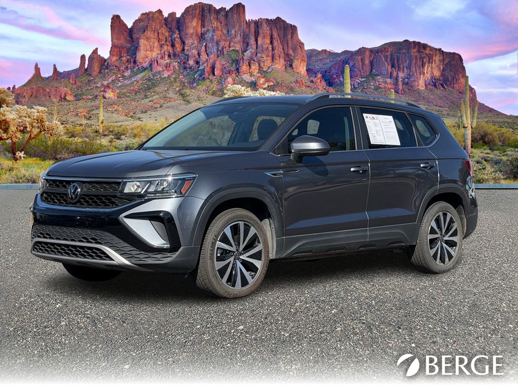 Serving The Valley For Over 40 Years! This Volkswagen Taos is equipped with the following features: 3.23 Axle Ratio, 4-Wheel Disc Brakes, 6 Speakers, ABS brakes, Active Blind Spot Monitor, Air Conditioning, Alloy wheels, AM/FM radio: SiriusXM with 360L, Auto High-beam Headlights, Auto-Dimming Rearview Mirror (SRV) (DISC), Brake assist, Bumpers: body-color, Cargo Area Retractable Privacy Cover, CloudTex & Cloth Seating Surfaces, Compass, Delay-off headlights, Driver door bin, Driver vanity mirror, Dual front impact airbags, Dual front side impact airbags, Electronic Stability Control, Emergency communication system: VW Car-Net Safe & Secure 5-year, Exterior Parking Camera Rear, First Aid Kit, Front anti-roll bar, Front Bucket Seats, Front Center Armrest, Front reading lights, Front Strut Rear Torsion Beam Suspension, Front wheel independent suspension, Fully automatic headlights, Heated door mirrors, Heated Front Comfort Seats, Heated front seats, Heated steering wheel, Illuminated entry, Leather Shift Knob, Low tire pressure warning, Occupant sensing airbag, Outside temperature display, Overhead airbag, Overhead console, Panic alarm, Passenger door bin, Passenger vanity mirror, Power door mirrors, Power driver seat, Power steering, Power windows, Radio data system, Radio: MIB3 Composition Media AM/FM/HD, Rain sensing wipers, Rear anti-roll bar, Rear seat center armrest, Rear Sensors Credit, Rear window defroster, Rear window wiper, Remote keyless entry, Roadside Assistance Kit, Roof rack: rails only, Rubber Mats Kit (SNM), Security system, Speed control, Speed-sensing steering, Split folding rear seat, Spoiler, Steering wheel mounted audio controls, Tachometer, Telescoping steering wheel, Tilt steering wheel, Traction control, Trip computer, Variably intermittent wipers, and Wheels: 18" 2-Tone Machined Alloy.