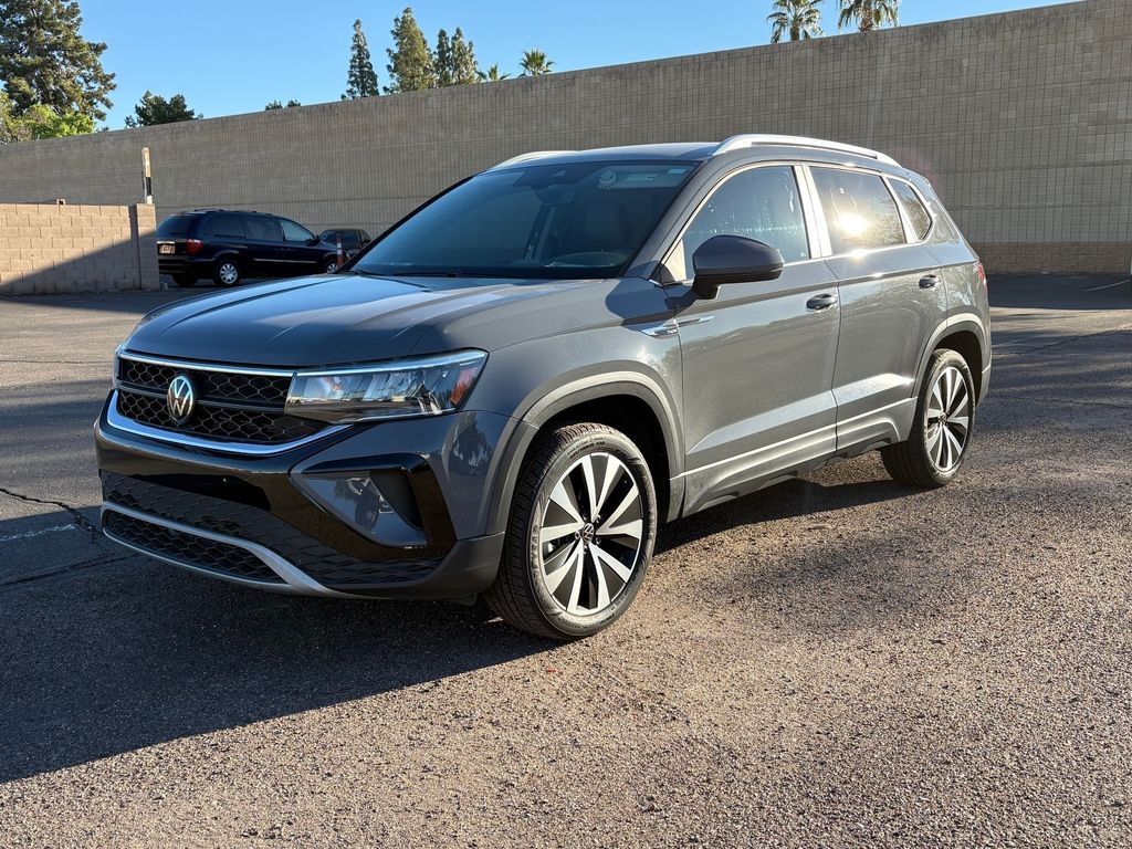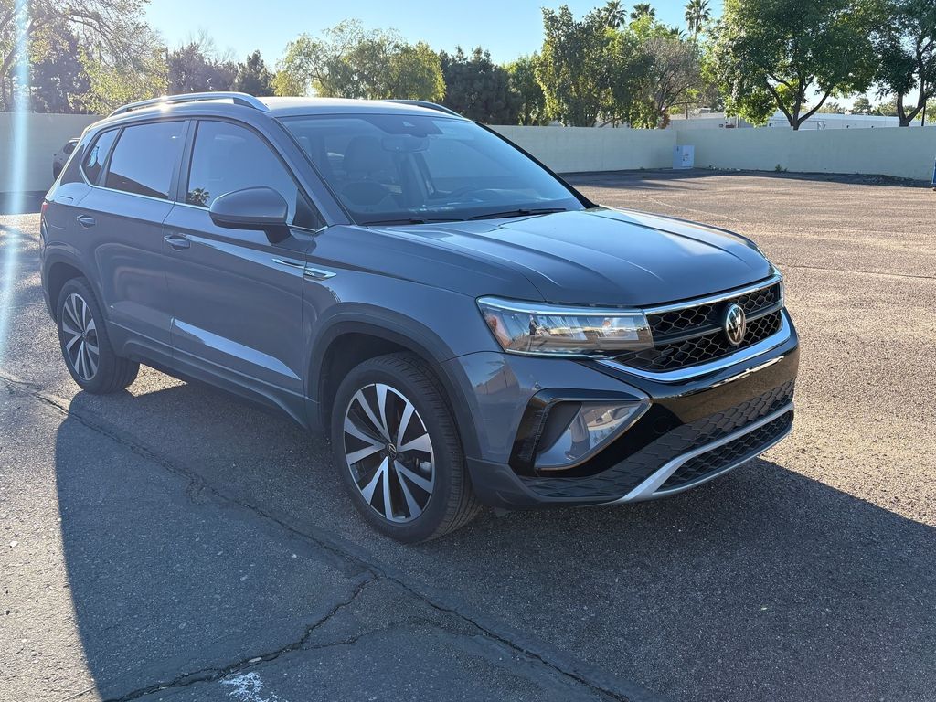 Serving The Valley For Over 40 Years! This Volkswagen Taos is equipped with the following features: 3.23 Axle Ratio, 4-Wheel Disc Brakes, 6 Speakers, ABS brakes, Active Blind Spot Monitor, Air Conditioning, Alloy wheels, AM/FM radio: SiriusXM with 360L, Auto High-beam Headlights, Auto-Dimming Rearview Mirror (SRV) (DISC), Brake assist, Bumpers: body-color, Cargo Area Retractable Privacy Cover, CloudTex & Cloth Seating Surfaces, Compass, Delay-off headlights, Driver door bin, Driver vanity mirror, Dual front impact airbags, Dual front side impact airbags, Electronic Stability Control, Emergency communication system: VW Car-Net Safe & Secure 5-year, Exterior Parking Camera Rear, First Aid Kit, Front anti-roll bar, Front Bucket Seats, Front Center Armrest, Front reading lights, Front Strut Rear Torsion Beam Suspension, Front wheel independent suspension, Fully automatic headlights, Heated door mirrors, Heated Front Comfort Seats, Heated front seats, Heated steering wheel, Illuminated entry, Leather Shift Knob, Low tire pressure warning, Occupant sensing airbag, Outside temperature display, Overhead airbag, Overhead console, Panic alarm, Passenger door bin, Passenger vanity mirror, Power door mirrors, Power driver seat, Power steering, Power windows, Radio data system, Radio: MIB3 Composition Media AM/FM/HD, Rain sensing wipers, Rear anti-roll bar, Rear seat center armrest, Rear Sensors Credit, Rear window defroster, Rear window wiper, Remote keyless entry, Roadside Assistance Kit, Roof rack: rails only, Rubber Mats Kit (SNM), Security system, Speed control, Speed-sensing steering, Split folding rear seat, Spoiler, Steering wheel mounted audio controls, Tachometer, Telescoping steering wheel, Tilt steering wheel, Traction control, Trip computer, Variably intermittent wipers, and Wheels: 18" 2-Tone Machined Alloy.