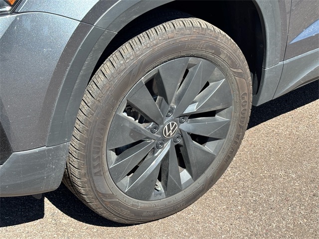 Serving The Valley For Over 40 Years! This Volkswagen Taos is equipped with the following features: 3.23 Axle Ratio, 4-Wheel Disc Brakes, 6 Speakers, ABS brakes, Active Blind Spot Monitor, Air Conditioning, Alloy wheels, AM/FM radio, Auto High-beam Headlights, Brake assist, Bumpers: body-color, Cloth Seating Surfaces, Compass, Delay-off headlights, Driver door bin, Driver vanity mirror, Dual front impact airbags, Dual front side impact airbags, Electronic Stability Control, Emergency communication system: VW Car-Net Safe & Secure 5-year, Exterior Parking Camera Rear, Front anti-roll bar, Front Bucket Seats, Front Center Armrest, Front reading lights, Front Strut Rear Torsion Beam Suspension, Front wheel independent suspension, Fully automatic headlights, Heated steering wheel, Illuminated entry, Leather Shift Knob, Low tire pressure warning, Occupant sensing airbag, Outside temperature display, Overhead airbag, Overhead console, Panic alarm, Passenger door bin, Passenger vanity mirror, Power door mirrors, Power steering, Power windows, Radio data system, Radio: Composition Color AM/FM, Rain sensing wipers, Rear anti-roll bar, Rear seat center armrest, Rear window defroster, Rear window wiper, Remote keyless entry, Roof rack: rails only, Rubber Mats Kit (SNM), Speed control, Speed-sensing steering, Split folding rear seat, Spoiler, Steering wheel mounted audio controls, Tachometer, Telescoping steering wheel, Tilt steering wheel, Traction control, Trip computer, Variably intermittent wipers, and Wheels: 17" Silver Painted Alloy.
