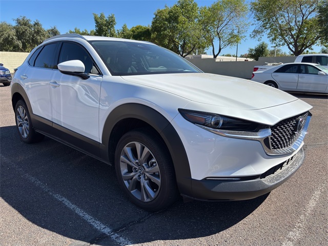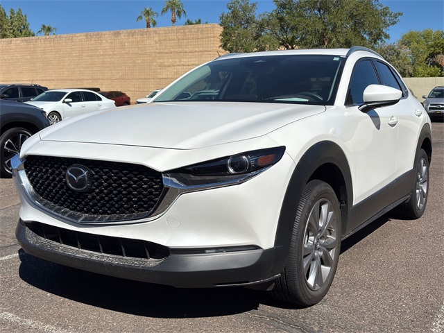 Serving The Valley For Over 40 Years! This Mazda CX-30 is equipped with the following features: Mazda Certified Pre-Owned Certified, 12 Speakers, 4-Wheel Disc Brakes, ABS brakes, Air Conditioning, Alloy wheels, AM/FM radio: SiriusXM, AppLink/Apple CarPlay and Android Auto, Auto High-beam Headlights, Automatic temperature control, Brake assist, Bumpers: body-color, Cargo Cover, Compass, Delay-off headlights, Driver door bin, Driver vanity mirror, Dual front impact airbags, Dual front side impact airbags, Electronic Stability Control, Emergency communication system: Mazda Connected Services (3-year trial subscription included), Exterior Parking Camera Rear, Front anti-roll bar, Front Bucket Seats, Front Center Armrest, Front dual zone A/C, Front reading lights, Front wheel independent suspension, Fully automatic headlights, Heads-Up Display, Heated door mirrors, Heated Front Bucket Seats, Heated front seats, High Wall All-Weather Floor Mats, Illuminated entry, Knee airbag, Leather Seat Trim, Leather Shift Knob, Leather steering wheel, Low tire pressure warning, MAZDA CONNECT Infotainment System, Memory seat, Navigation system: MAZDA CONNECT, Occupant sensing airbag, Outside temperature display, Overhead airbag, Overhead console, Panic alarm, Passenger door bin, Passenger vanity mirror, Power door mirrors, Power driver seat, Power Liftgate, Power moonroof, Power steering, Power windows, Radio data system, Radio: AM/FM/HD Audio w/Mazda Online Navigation, Rain sensing wipers, Rear seat center armrest, Rear side impact airbag, Rear window defroster, Rear window wiper, Remote keyless entry, Snowflake White Pearl Mica Paint Charge, Speed control, Speed-sensing steering, Split folding rear seat, Spoiler, Stainless Steel Rear Bumper Guard, Steering wheel mounted audio controls, Tachometer, Telescoping steering wheel, Tilt steering wheel, Traction control, Trip computer, Turn signal indicator mirrors, Variably intermittent wipers, and Wheels: 18" x 7J Aluminum Alloy.