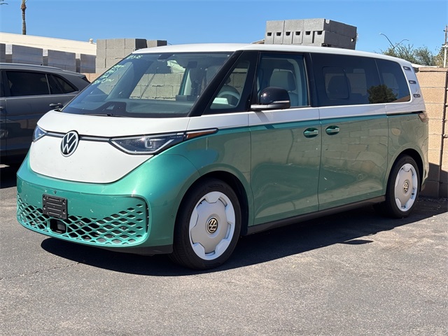 Serving The Valley For Over 40 Years! This Volkswagen ID. Buzz is equipped with the following features: 14 Speakers, 3rd row seats: split-bench, ABS brakes, Air Conditioning, Alloy wheels, Auto High-beam Headlights, Auto-dimming Rear-View mirror, Automatic temperature control, Brake assist, Bumpers: body-color, Delay-off headlights, Driver door bin, Driver vanity mirror, Driver's Seat Mounted Armrest, Dual front impact airbags, Dual front side impact airbags, Electronic Stability Control, Emergency communication system: VW Car-Net Safe & Secure 5-year, Exterior Parking Camera Rear, Four wheel independent suspension, Front anti-roll bar, Front Bucket Seats, Front dual zone A/C, Front fog lights, Front reading lights, Fully automatic headlights, harman/kardon Speakers, Heated & Actively Ventilated Front Seats, Heated door mirrors, Heated front seats, Heated rear seats, Heated steering wheel, Illuminated entry, Leather steering wheel, Low tire pressure warning, Memory seat, Navigation System, Occupant sensing airbag, Outside temperature display, Overhead airbag, Panic alarm, Passenger door bin, Passenger seat mounted armrest, Passenger vanity mirror, Perforated V-Tex Leatherette Seating Surfaces, Power door mirrors, Power driver seat, Power Liftgate, Power passenger seat, Power steering, Power windows, Radio data system, Radio: Discover Pro Max w/Touchscreen Navigation, Rain sensing wipers, Rear air conditioning, Rear anti-roll bar, Rear reading lights, Rear window defroster, Rear window wiper, Rearview Mirror w/HomeLink Connect, Remote keyless entry, Roof rack, Speed control, Speed-sensing steering, Split folding rear seat, Spoiler, Steering wheel mounted audio controls, TBD Axle Ratio, Telescoping steering wheel, Tilt steering wheel, Traction control, Trip computer, Turn signal indicator mirrors, Variably intermittent wipers, Ventilated front seats, and Wheels: 20" 1st Edition Alloy.